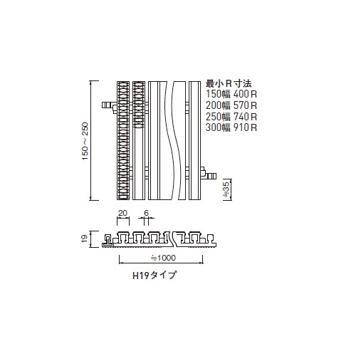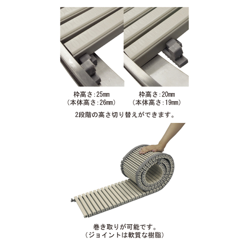 [色]アイボリー[サイズ]幅251〜300mm、長さ1000mm、高さ19mm [材質]本体:軟・硬質塩ビニール ジョイント:エラストマー(オレフィン系) 補強材:ステンレス(幅201mm以上) 購入に関するご注意 特長 ・2段階の高さ調整ができ、直線・曲線にも対応可能な樹脂製グレーチングです。 ・ジョイント部をスライドさせる事で25mmと20mmの2種類の枠の高さに切り替えが可能です。新築だけでなく、リニューアル物件にも汎用性を確保しています。 ・巻き取り可能な事で、取り外しが容易になり清掃効率が向上します。 ・曲線タイプは、設置する曲線(R)に合わせて対応が可能です。 ・25mmと20mmの枠の高さに合わせた現地対応が可能です。 ・接着剤を使用しない構造のため、幅や長さの微調整が現地で行えます。 ・最大幅250mmまでのサイズに合わせて溝蓋の別注製作が可能です。 ご注意 ・ご注文時に設置する受枠の形状に合わせて、本体部の高さ(26mmか19mm)、直線か曲線かをご指示ください。(受枠は、別売になります) ・19mmは別途エンド部が必要になります。 ・#151 〜 199、#201 〜 250、#201 〜 250、#251 〜 300は、その範囲で任意の幅をご指示ください。 ・補強材は、幅201mm以上の場合に付いています。