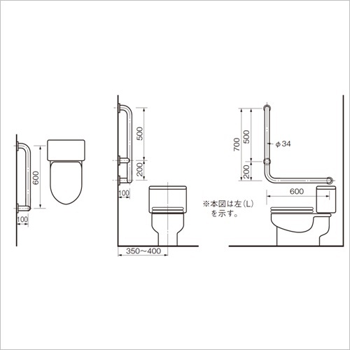 多用途にご利用いただけるL型手すりです。 [サイズ]700mm×600mm×100mm [本体重量]3.1kg [材質]SUS304・軟質塩ビ [仕上]軟質塩ビ被膜 【ご注意】はさみ込み取付の場合に限り、はさみ込み取付部品(別途)が3個必要となります。特注サイズにて製作可能です。 購入に関する注意事項 備考 代表画像を表示しています。