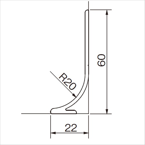 [品番/呼称]20R-60AL[サイズ]60mm×22mm×3000mm [材質]アルミ [仕上げ]アルマイトシルバー・クリアー塗装 購入に関する注意事項 特長 ・巾木にRを持たせることによって、床の隅部を清掃しやすくし、衛生状態を保ちます。 ・コーナー部や端部などの部材もご用意しております。 ・両面テープやビス止めでの固定なので設置が容易で、既存の設備に後付け施工も可能です。 ご注意 ・定尺寸法での出荷となります。 ・固定方法が両面テープの商品は、予め両面テープを貼って出荷致します。