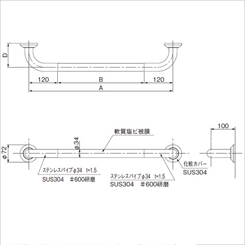 化粧カバーを含むエンドブラケット部(L型はコーナー部含む)は、高級感のあるステンレス研磨(#600研磨)となっており、直線のにぎり部分には軟質塩ビ被膜が施されているコンビタイプです。ホテルや商業ビルなどデザイン性の高い公共施設におすすめです。 [サイズ]A800mm、B560mm、C100mm [本体重量]1.7kg [材質]エンド部・コーナー部 SUS304 直線部 軟質塩ビ被膜 [仕上]エンド部・コーナー部 研磨 【ご注意】表記以外の形状も特注にて製作可能です。 購入に関する注意事項 備考 代表画像を表示しています。