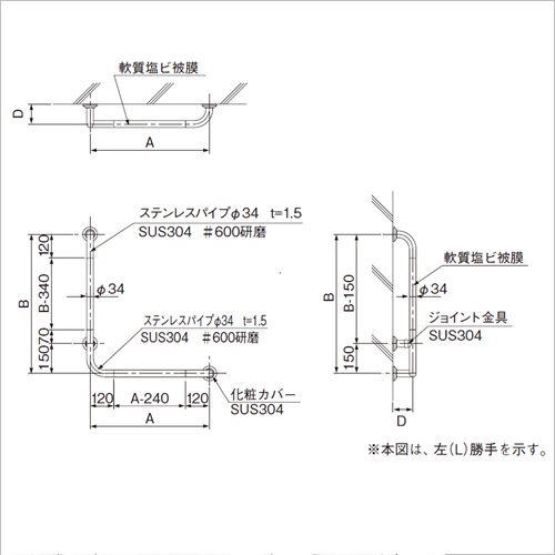 化粧カバーを含むエンドブラケット部(L型はコーナー部含む)は、高級感のあるステンレス研磨(#600研磨)となっており、直線のにぎり部分には軟質塩ビ被膜が施されているコンビタイプです。ホテルや商業ビルなどデザイン性の高い公共施設におすすめです。 [サイズ]A600mm、B700mm、C100mm [本体重量]2.6kg [材質]エンド部・コーナー部 SUS304 直線部 軟質塩ビ被膜 [仕上]エンド部・コーナー部 研磨 【ご注意】表記以外の形状も特注にて製作可能です。 購入に関する注意事項 備考 代表画像を表示しています。