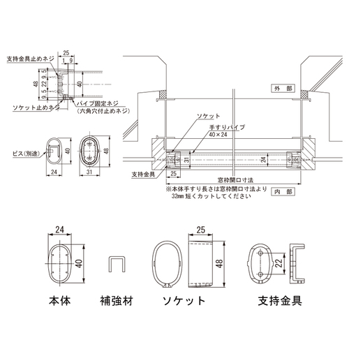 ・楕円型手すりは、角型よりも握る力が込めやすい丸味を持たせた握りやすい屋内用手すりです。・丸型よりも手すりをねじる力に対しての手のひらの抵抗力が大きいため、身体のバランスを保つのに効果があります。 ・手を滑らせながら使われる方が多い公共建物から、しっかり握って使われる方が多い住宅施設まで広い用途に適しています。 ・安全性・バイアフリーを考慮し、EHP補強材を使用することにより破断強度を向上させています。 ・開口幅の額縁に使用される際は、スチール補強材を内部に設けられる構造になっています。 ・シルバー(S)、ステンカラー(SC)は、抗菌アルマイト処理を施しており清潔さを保ちます。 ・木目ナチュラルは、水転写による木目調塗装で、熱転写により耐久性、耐候性に優れています。 [材質]アルミ [サイズ]2t×40×24×1400mm [重量]952g 購入に関する注意事項 ご注意 ・窓枠開口寸法(額縁内寸法)より、32mm短くカッ卜してください。 ・パイプ長さ1500mm以上の場合は、補強材をご使用ください。 ・パイプ長さ4000mmもご用意できます。1800mmより長いサイズをお求めの場合はお問い合わせください。 ・パイプ長さ1800mm以上でご使用の際は、中間支持を設けるなど考慮してください。 ・納期:ご確認ください。