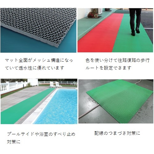 [色] レッド[材質] 塩化ビニール(PVC) [入数] 1巻 [サイズ] W900mm×L10m×t6mm [重量] 約29.7kg 購入に関する注意事項 特長 ・建築現場や足元の悪い場所などに引いて、足場の確保、すべり止めになります。 ・特に水の多い場所での使用に効果があり、敷いていただくだけですべり止め効果があります。 ・重量物になりますので、置いていただくだけで設置可能です。 ・高いグリップ性能で足元のすべり止め対策に最適です。適度な弾力で歩行時の衝撃を和らげます。 ・マット全面がメッシュ構造になっていて、透水性に優れています。 ・厚さ6mmで水たまりが発生しにくく、水によるすべり止め対策に有効です。 ・色を使い分けて、往路復路の歩行ルールを設定できます。 ・ロール形状、長尺仕様で簡単に設置できます。 ・ケーブル、配線のつまづき対策になります。カッター、ハサミで簡単にカット加工することができます。 ・耐久性に優れ、一時的な車両の通行でも耐えられます。 ・プールサイドや浴室のすべり止め対策など、幅広くご利用いただけます。 ・マット上での車両のハンドル操作、大型車両の通行、車両の長時間停車はお避けください。破損・跡残りが発生する可能性があります。