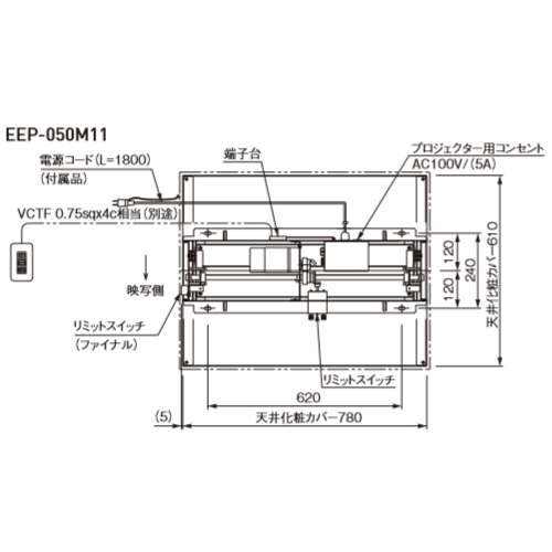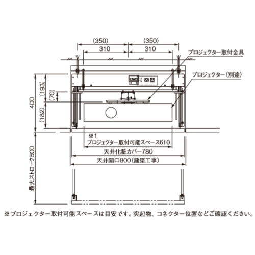[搭載質量]最大30kg[昇降ストローク]500mm [必要な設置スペース]800×630mm [サイズ]H780×W610×D500mm [重量]30kg ※プロジェクター取付可能スペースは目安です。突起物、コネクター位置などご確認ください 購入に関する注意事項 ※画像は代表画像です。 特長 ・プロジェクターを天井設置する昇降機。 ・普段は天井内に収め使用する時のみ任意の位置にセットできます。 ・部屋の意匠を損なわず、省スペースで設置可能です。 ・天井に合わせた様々な対応が可能です。 ・別途建築工事にて、架台・補強工事が必要です。 ・防塵効果や見栄えを良くする天井内の加工が可能です。 ・壁埋め込みスイッチ仕様を標準化(赤外線リモコン操作にも特注にて対応可能)