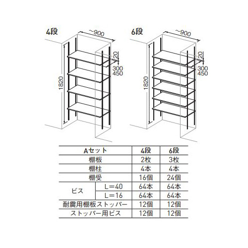 [材質]・棚板:(芯材)集成材、(表面材)MDF、(表面)EBコート仕様 ・棚柱:アルミ ・棚受:SUS430 [色]シェルホワイト [サイズ]H1820×W〜900×D300mm、板厚20mm [耐荷重]D300:25kg/段、D450:40kg/段 [重量]11.3kg 購入に関する注意事項 特長 ・設置場所に合わせて選べる便利な収納用の可動棚板セットです。 ・両壁がある収納スペースに最適なAタイプと、片側ありもしくは両壁オープンスペース(両側壁なし)に最適なBタイプがございます。 ・大掛かりな工事も不要なので、簡単便利、お手軽なリフォームを実現します。 ・サニタリー以外にも物入れ、パントリー、リネン庫などでご使用いだたけます。 ご注意 ・耐荷重は目安であり、保証値ではありません。 ・詳しい取付けは、施工説明書をご覧ください。 ・納期:お問い合わせください。