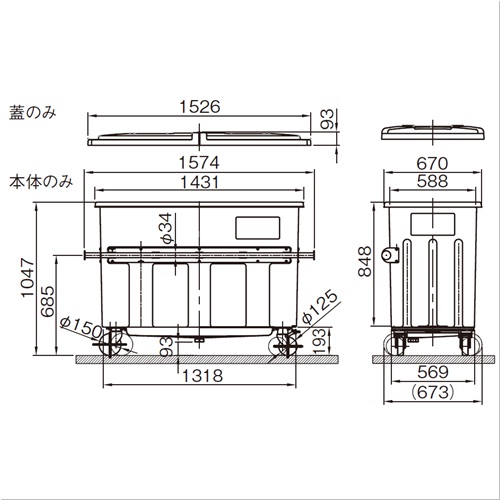 ・0.7m 3 反転コンテナボックスです。・大型のマンション、公団・都営住宅、施設向きです。 ・多くの傾倒装置付き車両に対応します。 ・キャッチバー寸法は、幅1574×Φ34、高さ685mmです。 ・掃除が簡単な排水キャップ付きです。 ・ワンタッチで固定と解除が可能なイージーストッパーを装備しています。 ・蓋は取り外し式です。 [色]グリーン [品番/呼称]#700F-S(G) [サイズ]H1047mm、W1574mm、D670mm [重量]49kg [材質]ポリエチレン [ご注意] ・本体と蓋は別売です。 ●許容荷重:280kgf ●容量:700l 購入に関する注意事項