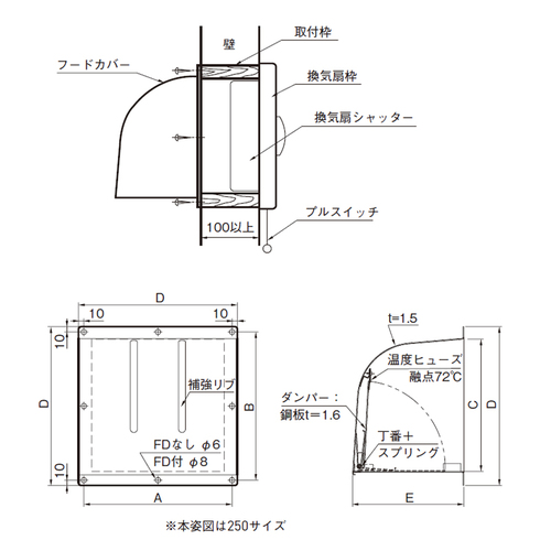[サイズ]350x250x350mm[本体重量]5300g [材質]SUS304 [仕上]2B ●換気扇:25cm用 【ご注意】ファイヤーダンパー(FD)が作動する時、換気扇のシャッターにあたらないよう壁厚100mm以上の壁に取付けてください。バルコニー、廊下で取付け位置が低い場合は怪我防止のため、正面左右に保護用のフードカバー用ゴムパッキンをご使用ください。ゴムパッキンは防水用ではありません。ゴムパッキンは、524-835・836・837には付属されております。防虫用ネットの取付ネジはフードカバー本体に付属しています。 購入に関する注意事項
