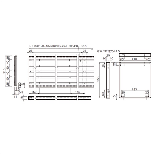 [品番/呼称]A-1200 [サイズ]210mm×1200L [重量]2.3kg [材質]SUS430 [仕上げ]研磨 [ご注意] ・壁への取付けはレンガ、下地材等に木ネ ジ止めとし、壁仕上げ面とのすきまには 付属のゴムパッキンΦ20をご使用くださ い。 購入に関する注意事項