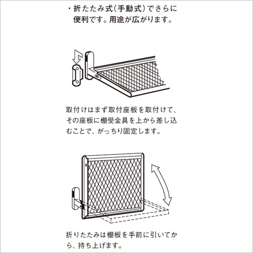 折たたみ式(手動式)でさらに便利です。用途が広がります。[サイズ]246mm×607mm [本体重量]0.5kg [材質]ステンレス [仕上]研磨 [耐荷重]5kgf 購入に関する注意事項