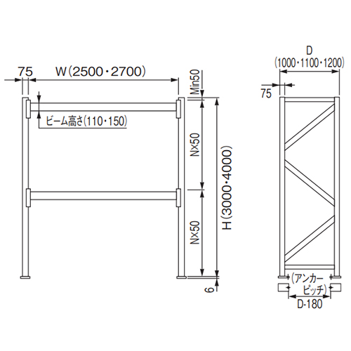 ・最大積載質量2,000kg/段(等分布載荷)・デッキチャンネル仕様 ・段上下ピッチ50mm [色]サングレー色 [品番/呼称]DC23511K [サイズ]H3000mm、W2500mm、D1100mm [ご注意] ・色はサングレー色(アイボリー)となります。 ・その他サイズも揃えています。お問い合わせください。 ・掲載写真は印刷のため、実際とは多少異なります。 ・新JIS規格(2018年版)に対応した仕様もあります。 [棚枚数(N)]2 購入に関する注意事項 ・色はサングレー色(アイボリー)となります。 ・掲載写真は印刷のため、実際とは多少異なります。 ご注意 ・支柱幅75タイプの本体外寸法はH+6・W+170・D(mm) ・標準寸法以外に特注も対応いたします。詳細はお問合せください。 ・新JIS規格(2018年版)に対応した仕様もあります。