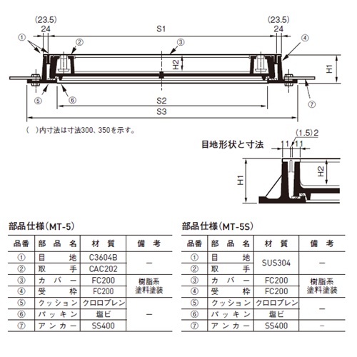 簡易密閉型(簡易防水・防臭)/真鍮目地/ステンレス目 地充填深さ33mm(44mm) 適用荷重:T-2[サイズ]580x580x57mm [本体重量]28.6g [材質]FC200 [仕上]樹脂系塗装 ●備考:真鍮目地 ●部品仕様(MT-5) (1)目地 C3604B (2)取手 CAC202 (3)カバー FC200 樹脂系塗料塗装 (4)受枠 FC200 樹脂系塗料塗装 (5)クッション クロロプレン (6)パ ッ キ ン 塩ビ (8)アンカー SS400 【ご注意】カバーの開閉にはMF-1型フック(オプション)を使用いたします。屋外で使用の場合は、取手の裏側に付いているキャップを外 してご使用ください。取手内に水が溜まり、仕上げ面を汚す原因にもなります。 購入に関する注意事項