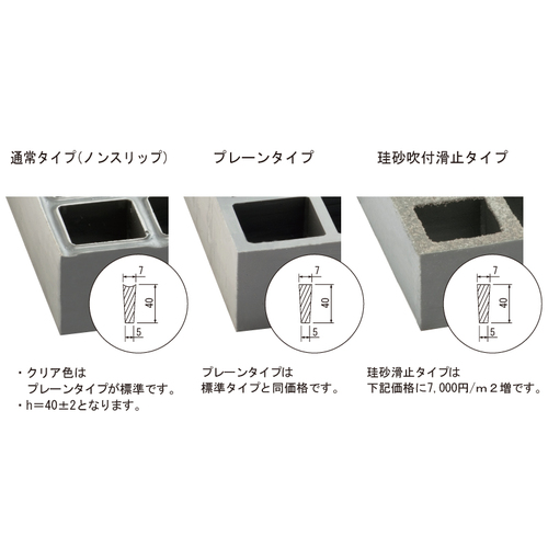 ・格子状のため軽くて強く、採光、通気性に優れています。また、比強度は、鉄(鉄鋼)5.4、アルミニウム7.0に対し、FRPは15です。・耐用年数が長く、顔料で着色しているので再塗装や取替えの必要がありません。錆びることもなく、薬品がかかっても大丈夫。さらに電気を通さず磁気もありません。 ・耐薬品性を最大限に活用し、ほとんどの希釈酸や塩の溶液に対して優れた耐候性を示します。 ・ノンスリップタイプは、ベアリングバーの表面に凹部をつけているので、あらゆる方向に対して、スベリ防止効果があります。 ・ガラス繊維を特殊技術で配合し、樹脂に定加温効果を施しているため、品質にバラツキがありません。 [色]グレー [品番/呼称]FR(N)-6S440GL [サイズ]3007mm×1007mm×40mm [重量]56kg [材質]FRP 不飽和ポリエステル ●特性:難燃性、耐酸・耐塩性 ●面積:3028平方メートル 購入に関する注意事項 ご注意 ・加工を含む場合は別価格となります。 ・グレー色以外の色(アイボリー・ホワイト・クリア)は別価格となります。ライトグレーは同価格です。 ・クリア・ホワイト色は紫外線の吸収塗装を標準としております。 ・ FRはプレーンタイプ(表面フラット)、FNはノンスリップタイプです。ご発注時にご指示ください。 ・クリアタイプはプレーン(表面フラット)タイプを標準としております。その他の色もプレーンタイプの製作が可能です。 ・珪砂吹付滑止タイプ(別価格)の製作も可能です。 ・取付・受枠金具は次ページをご覧ください。 ・北海道、沖縄は別価格となります。 ・納期:お問い合わせください。