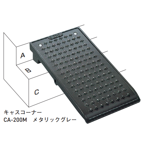 [サイズ]長さA300mm、出幅B540mm、高さH45〜200mm[本体重量]13.0kg [付属品]ユニクロ製連結用ボルト(φ10)、ナット、ワッシャー [材質]ダクタイル鋳鉄(球状黒鉛鋳鉄) [仕上]メラミン焼付塗装 [耐荷重]8t 購入に関する注意事項 ・CA-200のサイドコーナーは縞鋼板加工による特注品になります。お問い合わせください。 ・CA-200のご注文の際は、A・B・C寸法をご連絡ください。 特長 ・粘りと弾力性に富んだダクタイル鋳鉄製。割れたり変形せず半永久的に長持ちします。 ・焼付塗装仕上げにより、錆びにくく色落ちしません。 ・ノンスリップの表面加工で、雨の日にも滑りにくくなっています。 ・あらゆる段差に合わせた各種サイズが豊富に揃っています。 ご注意 ・8t用、サイレント(ゴム製)のものは、キャタピラ、ブルドーザー、ダンプカーでのご使用はご遠慮ください。 ・私道以外での設置はご考慮ください。 ・A+C寸法は200mm程度で使用してください。 ・脚を履かせない状態での本体板厚(高さ)は45mmです。 ・一段段差での使用も70mm高から可能です。 ・CA-200Mの高さ調節用の脚は、1枚で2個付属しています。高さ50mmから200mmまで16段階のベース(脚)が揃っています。 ・本体と脚の間にワッシャーをかませれば2mm単位の調節も可能です。