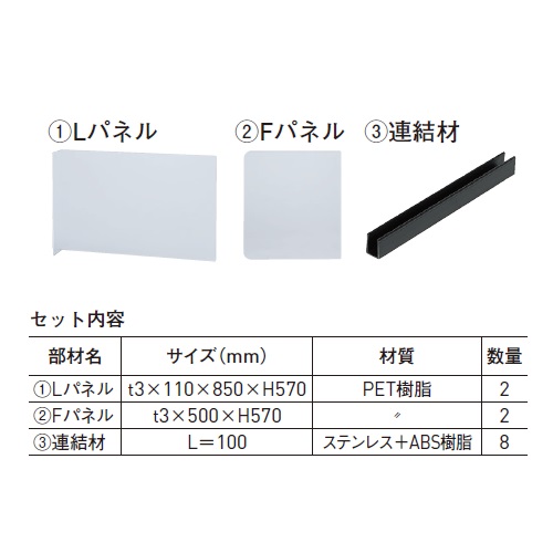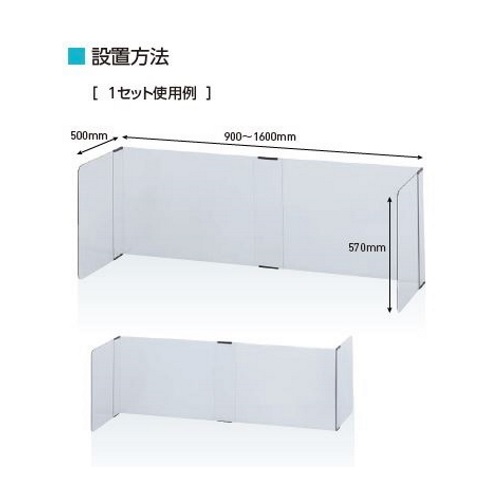 [材質] パネル:PET樹脂[サイズ] H570mm、L1600mm、W500mm [セット内容] Lパネル2枚、Fパネル2枚、連結材8本 [重量] 6kg 購入に関するご注意 ご注意 ・飛沫飛散抑制を目的とした簡易固定式の室内専用間仕切り製品です。他の用途に はご使用にならないでください。 ・飛沫感染を完全に防止するものではありません。定期的に換気を行うようお願い いたします。 ・パネルや連結材に過度な力がかかるような設置はお控えください。定期的に固定 部の安定性を確認してください。 ・屋外や火気付近、高温となる箇所の設置はお控えください。 ・お手入れする場合は、やわらかい布などを用い、中性洗剤かアルコールで軽く拭いて ください。 特長 ・オフィス向けの透明性に優れる視界良好な飛沫対策用パーテーションです。(PET樹脂製) ・開放空間を損なうことなく設置できるウィルス直接飛沫の対策が可能です。 ・デスクのレイアウトや使い方に合わせて配置や長さを変えることができます。 ・工具が不要です。連結材をはめ込むだけで簡単に設置ができます。 ・仕切り幅は、900mm 〜 1600mmまで対応いたします。(1セットの場合) ・透明樹脂は、食品衛生法に適合した素材を用いています。