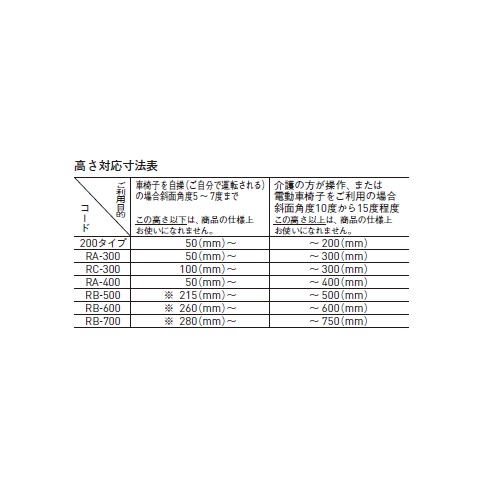 [品番/呼称]RA-300[サイズ]横幅A835mm(外形寸法905mm)、出幅B1250mm、高さ50mm〜300mm、板厚3.5mm [重量]13.4kg [材質]アルミ [仕上げ]生地 [耐荷重]300kgf 購入に関する注意事項 ご注意 ・表は車椅子で使用する場合の一般的な安全角度目安です。使用者の体力や車椅子の性能により若干の違いがあります。 ・車輌用としては、ご使用いただけません。 ・定型形、セミオーダーも承ります。お問い合わせください。 ・表記以外の高さ、角度以外でのご使用の場合は、特注品となります。お問い合わせください。