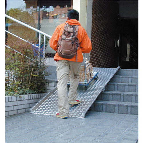 [品番/呼称]RB-600[サイズ]横幅A835mm(外形寸法905mm)、出幅B2400mm、高さ260mm〜600mm、板厚3.5mm [重量]26.8kg [付属部品]補強支柱 [材質]アルミ [仕上げ]生地 [耐荷重]300kgf 購入に関する注意事項 ・階段の断面図をお送りください。 ・RBは折り畳み式のため、1段差での使用の場合※260mm以下の数字ではヒンジ部分がぶつかります。 ・RBには補強支柱が付属します。3種類のサイズから最適なものをご用意しますので段差の断面寸法をお送りください。 ご注意 ・表は車椅子で使用する場合の一般的な安全角度目安です。使用者の体力や車椅子の性能により若干の違いがあります。 ・車輌用としては、ご使用いただけません。 ・定型形、セミオーダーも承ります。お問い合わせください。 ・表記以外の高さ、角度以外でのご使用の場合は、特注品となります。お問い合わせください。