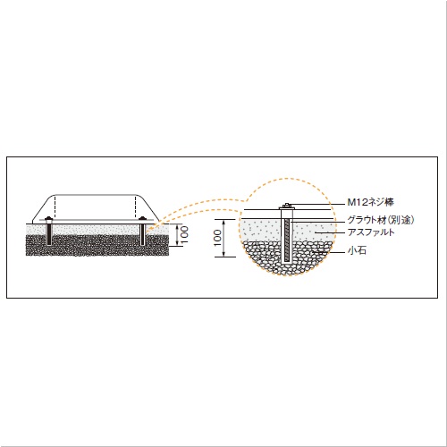 コンクリート下地用ならその日のうちに使用できます。長年の使用に耐えるプロ用の肉厚成形製品です。 高さ120mmの安全設計です。 カーストッパーST-500G(アスファルト下地)Gタイプ適用車両普通乗用車まで アスファルト下地にネジ棒で、しっかり固定します。 商業施設等の取付けをより確実にするために、アスファルトにアンカードリルで径25mm深さ100mmの穴を開けます。 グラウト材を流し込み、M12ネジ棒を差し込み、固定後、増し締めして下さい。 ※グラウト材1kgで、6本取付けできます。 [サイズ]H120mm、L500mm、D130mm [本体重量]2700g [付属品]スチールM12ネジ棒:2本、ナットワッシャー:2組 [材質]合成樹脂 【ご注意】アスファルト下地でのグラウト工法(ST500G)は、アスファルト厚が50ミリ以上あり砕石が施してある規格下地であれば可能です。設置後、ボルトの締め付けは必ずグラウト材の硬化後に行ってください。気温や湿度によって条件が変わりますので24時間の養生が理想的です。但し、ボルトを強く締めすぎるとネジ棒が上がってきます。 購入に関する注意事項