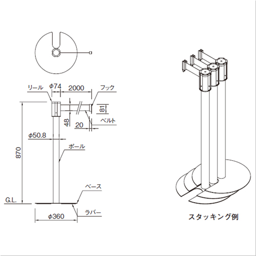 スタッキングできます。ベルト先端のフックを引き出し、もう一方のポール上部のリールに差し込むことで動線確保が可能です。 ベルトが自動的にリールに巻き込み、移動・持ち運びがスマートに行えます。 ベースは、映り込みが少ないようにヘアーライン仕上げを施してあります。 [サイズ]870x360x360mm [本体重量]5800g [材質]ポール・ベース:SUS304 リールカバー:アルミ ベルト:ナイロン [仕上]ポール:研磨 ベース:ヘアーライン ●備考:ベルト2m 購入に関する注意事項 ご注意 屋外あるいは強風・水のかかる場所でのご使用はできません。 この商品は単品(1本)販売です。2本以上にてご使用ください。