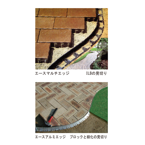 ・近年、公園・建物外構等の舗装材のデザインが複雑化してきています。独特の切断・屈曲構造により、事前設計せずに直線や曲線をスピーディに見切れる樹脂製とアルミ製の見切材です。・ILB、レンガ、コンクリート平板のエッジ材や、緑化の見切りなど様々な用途に利用できます。ME-35(ロータイプ)は土舗装、芝などに最適です。アルミエッジはアスファルト、ブロック舗装に適しています。 [品番/呼称]ME-50 [サイズ]50mm×2020mm [材質]高密度ポリエチレン ●備考:本体1本、釘5本 購入に関する注意事項 代表画像です。 ご注意 エースマルチエッジの釘固定ピッチは、車寄せ・屋敷内車道の場は300mm(7本使用)、遊歩道の場合は600mm(4本使用)が目安です。 エースアルミエッジのスパイク固定ピッチは直線部は300mm、曲線部は100mmが目安です。