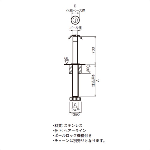 [製品仕様] ステンレス ヘアライン[サイズ]φ48.6×H700 (ポール径 φ48.6mm(t1.5)/化粧ベース径 φ110mm/シェル径 φ65mm/埋込深さ 811.5mm) [重量]3.5kg [目的機能] 埋没式 / チェーン貫通 / ロック機構付 購入に関する注意事項 備考 代表画像を表示しています。