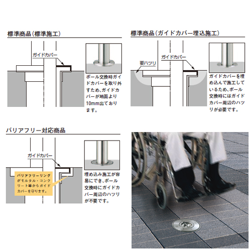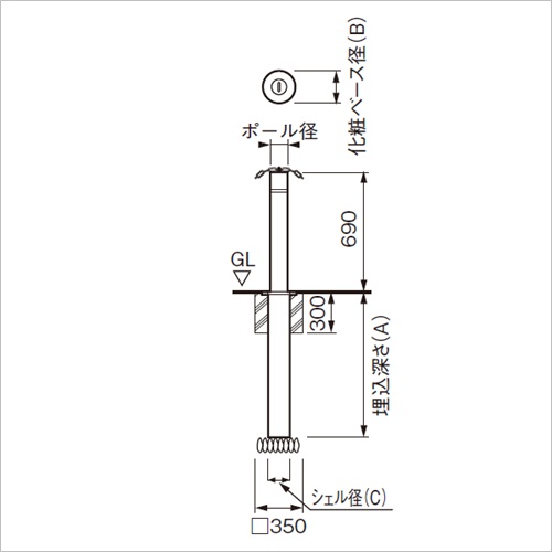 [製品仕様] ステンレス ヘアライン[サイズ]φ114.3×H690 (ポール径 φ114.3mm(t2)/化粧ベース径 φ222mm/シェル径 φ139.8mm/埋込深さ 823mm) [重量]13.0kg [目的機能] 除雪車対応 / 埋没式 / チェーン貫通 / ロック機構付 / バリアフリー 購入に関する注意事項