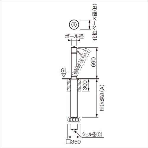 [製品仕様] ステンレス ヘアライン[サイズ]φ76.3×H690 (ポール径 φ76.3mm(t1.5)/化粧ベース径 φ152mm/シェル径 φ95mm/埋込深さ 823mm) [重量]9.0kg [目的機能] 除雪車対応 / 埋没式 / チェーン内蔵(L2000 φ4) / ロック機構付 / バリアフリー 購入に関する注意事項