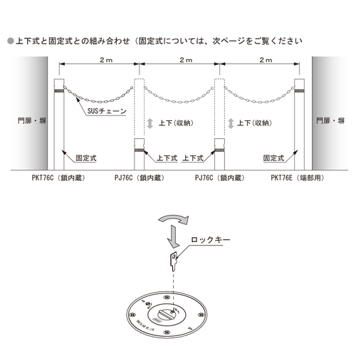 [径]φ76.3[材質]ポリプロピレン [色]ダークグレー [仕様 鍵タイプ]ワンタッチ [仕様 鎖型式 ]内蔵 [重量 ]6.6kg 購入に関する注意事項 特長 ・ポール本体は樹脂製なので錆びることがありません。 ・金属製と比較し軽量化を実現しました。引き上げ力は、一般のSUSポール(チェーン内蔵型)と比べ、約43%減の約2.5kgfです。 ・SUSチェーンを出し入れする際、接触音が軽減されます。 ・本体のカラーバリエーションは5色です。設置場所の景観に合わせてお選びいただけます。 ・上下式と固定式(次ページ掲載)を組み合わせてご使用いただけます。 ・ロックキー2本付 ご注意 ・内蔵チェーンはステンレス製、2メートルです。ポール本体を2メートルの間隔で設置してください。 ・施工の際は、同梱の取付説明書をよく読み確実に行ってください。 ・サットワンは、雨などによる浮力配慮の施工をしてください。 ・ご使用の用途に沿って、鎖内蔵タイプ「PJ76C」、端部タイプ「PJ76E」、鎖無一般タイプ「PJ76N」を組み合わせてお使いください。 ・サットワン Mタイプは、受注生産となります。 ・レッドとグリーンは品切れ後、取扱中止となります。 ・端部タイプ「PJ76E」は品切れ後、取扱中止となります。取扱中止後は、「PJ76C」で代用してください。