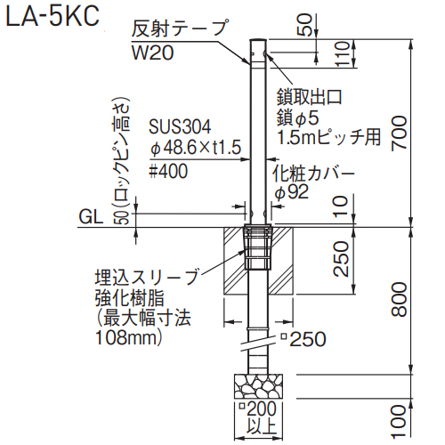 頭部を胴体部より若干大きくすることにより、地中収納時に砂が入りにくくなっています。また、大きく出ていないため、誤って落下させた場合でも足元は安全です。 南京錠で施錠するタイプです。 南京錠を取り付けるロックピンは、本体に内蔵されますので、紛失の心配がありません。 [サイズ]φ48.6mm×H700mm [本体重量]3.4kg [材質]SUS304 [仕上]研磨(♯400) ●仕様(1):クサリ内蔵(1.5m) ●仕様(2):カギ付(南京錠25mm) 【ご注意】固定式や脱着式もあります。 購入に関する注意事項