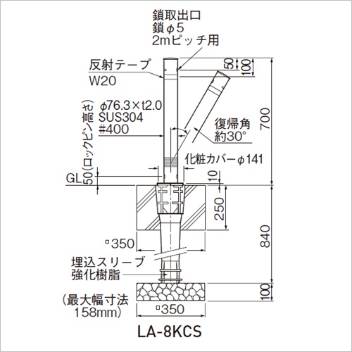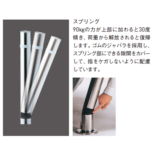 90kgの力が上部に加わると30度傾き、荷重から解放されると復帰します。ゴムのジャバラを採用し、スプリング部にできる隙間をカバーして、指をケガしないように配慮しています。 ロックピンが内蔵され、ロックも解除も専用キー1本で行うタイプです。 スマートな取り回しが可能です。 [サイズ]φ76.3mm×H700mm [本体重量]8.2kg [材質]SUS304 [仕上]研磨(♯400) ●仕様(1):クサリ内蔵(2m) ●仕様(2):ワンタッチロック付 ●仕様(3):スプリング付 【ご注意】固定式や脱着式もあります。 購入に関する注意事項