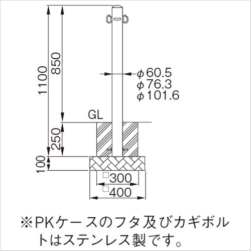 PKタイプ(脱着式:フタ付ケース・カギ付):ケースと柱を施錠し、部外者が無断で柱を取りはずせないタイプです。地中に埋めたフタ付のケースと南京錠で施錠します。※ PKケースのフタ及びカギボルトはステンレス製です。 [品番/呼称]S52-PK [サイズ]Φ60.5mm×H850mm [重量]4.0kg [材質]SUS304 [仕上げ]ヘアーライン ●仕様(1):脱着式 ●仕様(2):フタ付ケース ●仕様(3):カギ付(南京錠) 購入に関する注意事項