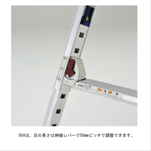 [型式]DXA-10B[天場の高さ]0.73〜1.07m [天場寸法]昇降面500×長さ1563mm [設置下端寸法]昇降面683〜768×長さ2088〜2267mm [保管収納寸法]長さ1685×685×150mm [質量]17.1kg [最大使用質量]150kg 購入に関する注意事項 代表画像を表示しています。 特長 ・仮設工業会認定合格品のタフな業務用足場台 ・現場のニーズに対応した500mm幅タイプ ・回転収納式手掛り棒を4本標準装備(DXA-13BT、15BT、18BTのみ) ・折りたたみ式ですので運搬時や収納時にスペースをとりません ・脚の長さは伸縮レバーで、50mmピッチで調整できます