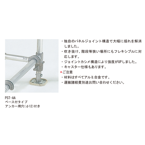 [品番/呼称]PST-2AA[サイズ]全高:4.10mm〜4.33m [重量]98.6kg [仕上げ]生地 [作業床の高さ]3.07mm〜3.30m [作業床寸法]0.66mm×1.09m [枠寸法(支柱中心)]0.75mm×1.20m [最大使用質量]150kg 購入に関する注意事項 特長 ・独自のパネルジョイント構造で大幅に揺れを解消しました。 ・吹き抜け、階段等狭い場所にもフレキシブルに対応します。 ・ジョイントカシメ構造により強度がUPしました。 ・キャスター仕様もあります。 ご注意 ・材料はすべてアルミ合金です。 ・運搬諸経費別途お問い合わせください。