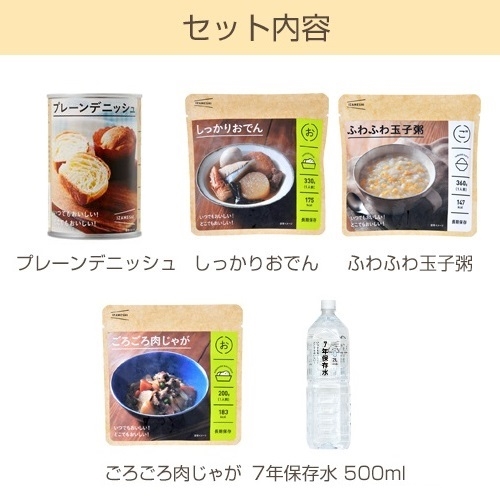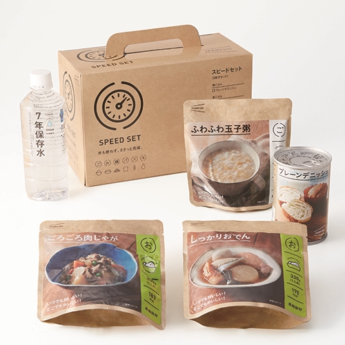 朝・昼・夜の、1日の食事が1箱に入った、イザというときの保存食として使いやすい「スピードセット」。馴染みのあるメニューが揃っています。 保存料はゼロ、添加物も最小限に押さえているため、大人から子供まで安心してお召し上がりいただけます。 水も使わず、ささっと完成します。 [箱サイズ]W27×D13×H17.5cm(持ち手含まず) [セット内容]プレーンデニッシュ、しっかりおでん、ふわふわ玉子粥、ごろごろ肉じゃが、7年保存水500ml(各1個) 購入に関する注意事項 IZAMESHI 食べずに捨てる備蓄食から、食べる長期保存食へ。 いつでも、どこでも、おいしく食べられる。 ご飯やおかずはもちろん、パンやスイーツまでフルコースの食事が揃う長期保存食IZAMESHI(イザメシ)。 災害時の備えとしてだけでなく、普段の食事でもおいしく食べられることにこだわったメニューです。 お召し上がり方 【おかず・粥・リゾット】 非常時は水や火を使わずに常温のままで封を開けるだけでおいしく召し上がっていただけます。 温める場合は、沸騰したお湯または、お皿に中身をあけて電子レンジで温めてください。 【デニッシュ】 缶から出してそのままお召し上がりいただけます。 缶切りなしで開けることができる、イージーオープン缶です。どこでも気軽に持ち出すことができます。 カップに入ったデニッシュが下向きに2個入っています。直接デニッシュに触らずに取り出せるので衛生的です。 ご注意 ・直射日光及び高温多湿な場所を避けて常温で保存してください。 ・製造から6ヶ月以内の商品をお届けいたします。 ・栄養成分表など詳細は各商品ページでご確認ください。 ・商品の仕様・価格は、改良のため予告なく変更する場合があります。変更後は、順次自然切替えとなります。