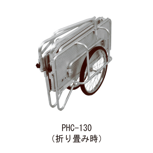 [品番/呼称]PHC-130[サイズ] ・寸法荷台幅:600mm×長さ:900mm ・全長:1860mm×全幅:870mm×全高:630mm×ハンドル長さ:840mm [重量]21kg [材質]アルミ合金 [最大積載荷重]130kg(f PHC-130)、150kg(f PHC-150) [収納寸法]長さ:1020mm、幅:370mm、高さ:750mm 購入に関する注意事項 特長 ・高強度アルミ合金を使用し、超軽量を実現しました。 ・前後の板が取り外しできるので小さな品物から長物まで幅広い運搬作業に対応できます。 ・クッション性に優れたスポーク式タイヤホイールを採用し、空気抜けの心配がいらないノーパンクタイヤを標準装備しています。タイヤは20インチです。 ・組み立てには工具のいらないノブボルトを使用。前後の板とガードパイプは取り外した後、本体に収納できます。