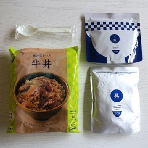 出汁のしみた牛肉とご飯がベストマッチ!さらに食欲が掻き立てられます。お米のパウチを容器にして、アルファ化米と出汁スープを混ぜ合わせるだけの簡単調理です。 1食当たり1〜1.5人前とボリューム満点! [名称]牛どん(どんぶりもののもと・アルファ化米) [原材料] どんぶりもののもと:野菜(たまねぎ、長ねぎ)、牛肉(オーストラリア産)、しょうゆ、砂糖、醸造調味料、しょうが、清酒、昆布エキス、かつお節エキス調味料、ポークエキス調味料、チキンエキス調味料、にんにく、食塩/増粘剤(加工でんぷん)、(一部に小麦・牛肉・鶏肉・豚肉・大豆を含む) アルファ化米(白飯):うるち米(国産) [内容量]どんぶりもののもと/285g、アルファ化米/80g [栄養成分表示(1食365gあたり)] エネルギー534kcal、たんぱく質17.4g、脂質11.1g、炭水化物88.3g、食塩相当量1.6g [アレルギー物質について] 特定原材料:小麦 特定原材料に準ずるもの:牛肉、豚肉、鶏肉、大豆 [賞味期限]製造より3年間※製造から6ヶ月以内の商品をお届けいたします。 [1袋サイズ]W200×H255 mm 365g [保存方法]直射日光および高温多湿な場所を避けて常温で保存してください。 ※保存年数は製造日より起算しています。 購入に関する注意事項 IZAMESHIの丼シリーズ ごはんもセットになった調理水不要のボリューム満点シリーズ。 セットの具材とご飯を混ぜるだけで簡単にお召し上がりいただけます。 ・水を使わない アルファ化米と出汁スープの袋がセットになっています。 スープをお米に注ぐだけで食べられ、別途お水を用意する必要がありません。 お米のパウチを器にするこができ、スプーンも付属されているので食器が不要です。 ・ボリューム満点 従来のイザメシ、イザメシDeliと比べて、1食あたり1〜1.5人前のボリューム感です。 お子様や女性なら、災害時にシェアしてお召し上がりいただくことも可能です。 お召し上がり方 1.ごはん袋を開封し、脱酸素剤を取り出してください。 2.レトルト袋を開封して中身をごはん袋へ入れ、スプーンでよくかき混ぜてください。 3.ごはん袋のチャックを閉めてお待ち下さい。目安は常温で約60分です。 ※湯せんでレトルト袋を温め、アルファ化米と混ぜた場合、約20分で出来上がります。 ご注意 ・袋が破損すると商品にカビが発生したり、劣化の原因となります。 ・開封後は当日中にお召し上がりください。 ・脱酸素剤は食べられませんので取り除いてください。 ・本品は卵、乳成分、小麦、えび、かに、落花生、いか、まつたけ、カシューナッツ、ごま、さば、バナナ、りんご、大豆、牛肉、豚肉、鶏肉、ゼラチンを含む製品と共通の設備で製造しています。 ・商品の仕様・価格は、改良のため予告なく変更する場合があります。変更後は、順次自然切替えとなります。