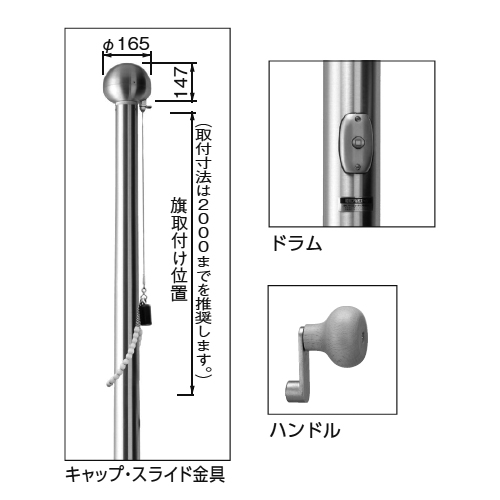 ・ワイヤーをポールに内蔵し、ハンドル操作で昇降するタイプです。すっきりした美しい外観が魅力です。・ホテルやミュージアムなどの建物とも美しく調和します。 ・旗を取付けた頭部が、風向きにより360°回転する構造です。 ・旗の昇降時に使用するハンドルは取外し可能です。 [品番/呼称]9EP-Uzx [サイズ]地上高さH9000mm、根本径ΦD1:120mm、先端径ΦD2:75mm [重量]35kg ●分割数N:2 ●基礎寸法:h1000mm、w600mm 購入に関する注意事項 ご注意 ・基礎寸法は、地耐力10ton//平方メートルで設計した参考寸法です。 ・設計風速は建築基準法施工令第3章第87条風圧力による各地域の基準風速に準拠しています。 ・設置高が地上15mまでの場合にご利用ください。 ・強い風の想定される場所(海沿いや山頂など)に設置をご検討の場合はお問い合わせください。 ・基礎工事の際、水抜き用孔をふさがないでください。 ・大旗や鯉のぼりなどの取付けはお避けください。 ・埋込部分はポール本体に黒色塗装が塗布してあります。(EP-Uzxのみ) ・カラー塗装は(別途加算)、またアンカーボルトは別売りとなります。 ・重量はキャップ、昇降装置など部品を含む総重量です。 ・下記以外の仕様につきましては、別途お問い合わせください。 ・輸送の都合上、本体を分割しています。 ・事故防止のため、夜間は旗を掲揚したままにせず、日没時には旗を降ろしてください。 ・強風時(瞬間最大風速15m/s以上)は必ず旗を降ろしてください。故障の原因となります。 ・運搬諸経費は別途お問い合わせください。