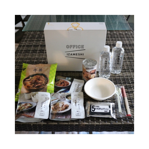 近くに置きたい、いつでも食べたい、オフィスの備蓄。満足感があるメニューの保存食5品と500ml水2本、1〜1.5日1人分を1箱に纏めました。 デスクの引き出しにすっきり入るサイズとなっているため、各自で無理なく備蓄できます。 また、賞味期限も見やすい位置に表示しているので、交換のタイミングもすぐにわかります。 紙皿や割り箸などのカトラリーとウェットティッシュが付属していますので、いざという時にも安心です。 [セット内容] ・大豆たっぷりカレーリゾット×1 ・トロトロねぎの塩麹チキン×1 ・りんごが決め手の生姜焼き×1 ・出汁のきいた牛丼×1 ・プレーンマフィン×1 ・7年保存水×2 [サイズ]W93×D317×H262mm(1箱) [付属品] (紙皿3枚、割り箸1膳、先割れスプーン1本、5年保証ウェットティッシュ1パック)×3 [賞味期限] ・マフィン:製造から5年 ・水:製造から7年 ・他保存食:製造から3年 [保存期間](ウェットティッシュ)5年保証 ※保存年数は製造日より起算しています。 購入に関する注意事項 OFFICE IZAMESHI 勤務中に災害にあったとき、社員が帰宅できるまで社内待機する時間、その目安を1.5日と考えました。 あわてて外に飛び出さず、情報を収集し、安全を確認したうえで帰宅する。 まずは、その1.5日を安心して過ごせるだけの水と食料、毛布、トイレを身近に確保しておくことが大切です。 緊急時に迅速に配布するためにも、備蓄アイテムは身近に保管しておく必要があります。 しかし、無機質で、かさばる備蓄アイテムは、地下室や倉庫の奥にしまわれがち。 そこで、OFFICE IZAMESHIは、社員の半径1m以内にきれいに収納できる、“見せる”備蓄システムを目指しました。 お召し上がり方 【おかず・粥・リゾット】 非常時は水や火を使わずに常温のままで封を開けるだけでおいしく召し上がっていただけます。 温める場合は、沸騰したお湯または、お皿に中身をあけて電子レンジで温めてください。 【丼】 1.ごはん袋を開封し、脱酸素剤を取り出してください。 2.レトルト袋を開封して中身をごはん袋へ入れ、スプーンでよくかき混ぜてください。 3.ごはん袋のチャックを閉めてお待ち下さい。目安は常温で約60分です。 湯せんでレトルト袋を温め、アルファ化米と混ぜた場合、約20分で出来上がります。 【餅】 乾燥餅、きなこ、黒みつ、戻し水、割り箸が全て入っています。 付属の戻し水で乾燥餅をもどし、きなこ・黒みつをかけてお召し上がりください。 やわらかいお餅と優しい甘さが疲れたからだに嬉しい1品です。 【マフィン】 缶から出してそのままお召し上がりいただけます。 缶切りなしで開けることができる、イージーオープン缶です。どこでも気軽に持ち出すことができます。 カップに入ったデニッシュが下向きに2個入っています。直接デニッシュに触らずに取り出せるので衛生的です。 ご注意 ・直射日光及び高温多湿な場所を避けて常温で保存してください。 ・保存食・水は製造から6ヶ月以内の商品をお届けいたします。 ・保存食の栄養成分表など詳細は各商品ページでご確認ください。 ・商品の仕様・価格は、改良のため予告なく変更する場合があります。変更後は、順次自然切替えとなります。