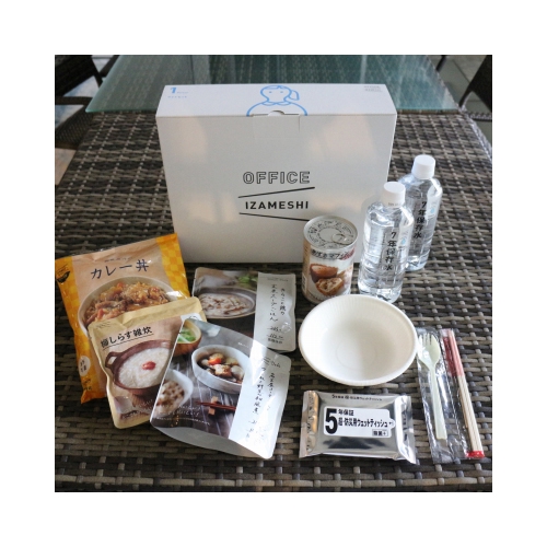近くに置きたい、いつでも食べたい、オフィスの備蓄。食べやすいライトなメニューの保存食5品と500ml水2本、1〜1.5日1人分を1箱に纏めました。 デスクの引き出しにすっきり入るサイズとなっているため、各自で無理なく備蓄できます。 また、賞味期限も見やすい位置に表示しているので、交換のタイミングもすぐにわかります。 紙皿や割り箸などのカトラリーとウェットティッシュが付属していますので、いざという時にも安心です。 [セット内容] ・梅しらす雑炊×1 ・きのこと鶏の玄米スープごはん×1 ・名古屋コーチン入りつくねと野菜の和風煮×1 ・和風出汁のカレー丼×1 ・あずきマフィン×1 ・7年保存水×2[サイズ]W93×D317×H262mm(1箱) [付属品] (紙皿3枚、割り箸1膳、先割れスプーン1本、5年保証ウェットティッシュ1パック)×3 [賞味期限] ・マフィン:製造から5年 ・水:製造から7年 ・他保存食:製造から3年 [保存期間](ウェットティッシュ)5年保証 ※保存年数は製造日より起算しています。 購入に関する注意事項 OFFICE IZAMESHI 勤務中に災害にあったとき、社員が帰宅できるまで社内待機する時間、その目安を1.5日と考えました。 あわてて外に飛び出さず、情報を収集し、安全を確認したうえで帰宅する。 まずは、その1.5日を安心して過ごせるだけの水と食料、毛布、トイレを身近に確保しておくことが大切です。 緊急時に迅速に配布するためにも、備蓄アイテムは身近に保管しておく必要があります。 しかし、無機質で、かさばる備蓄アイテムは、地下室や倉庫の奥にしまわれがち。 そこで、OFFICE IZAMESHIは、社員の半径1m以内にきれいに収納できる、“見せる”備蓄システムを目指しました。 お召し上がり方 【おかず・粥・リゾット】 非常時は水や火を使わずに常温のままで封を開けるだけでおいしく召し上がっていただけます。 温める場合は、沸騰したお湯または、お皿に中身をあけて電子レンジで温めてください。 【丼】 1.ごはん袋を開封し、脱酸素剤を取り出してください。 2.レトルト袋を開封して中身をごはん袋へ入れ、スプーンでよくかき混ぜてください。 3.ごはん袋のチャックを閉めてお待ち下さい。目安は常温で約60分です。 湯せんでレトルト袋を温め、アルファ化米と混ぜた場合、約20分で出来上がります。 【餅】 乾燥餅、きなこ、黒みつ、戻し水、割り箸が全て入っています。 付属の戻し水で乾燥餅をもどし、きなこ・黒みつをかけてお召し上がりください。 やわらかいお餅と優しい甘さが疲れたからだに嬉しい1品です。 【マフィン】 缶から出してそのままお召し上がりいただけます。 缶切りなしで開けることができる、イージーオープン缶です。どこでも気軽に持ち出すことができます。 カップに入ったデニッシュが下向きに2個入っています。直接デニッシュに触らずに取り出せるので衛生的です。 ご注意 ・直射日光及び高温多湿な場所を避けて常温で保存してください。 ・保存食・水は製造から6ヶ月以内の商品をお届けいたします。 ・保存食の栄養成分表など詳細は各商品ページでご確認ください。 ・商品の仕様・価格は、改良のため予告なく変更する場合があります。変更後は、順次自然切替えとなります。