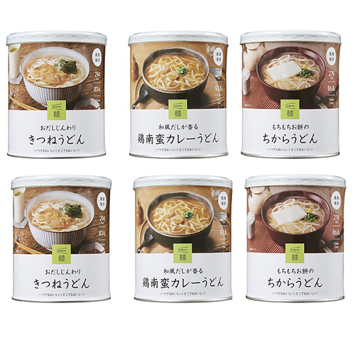 長期保存食「IZAMESHI」の、心まで温まる麺シリーズ。3種6品をセットにしました。 [箱サイズ]W340×D224×H126mm 1.6kg [セット内容]各2食(3種6品) ・おだしじんわり きつねうどん×2 ・和風だしが香る 鶏南蛮カレーうどん×2 ・もちもちお餅の ちからうどん×2 購入に関する注意事項 「IZAMESHI」の麺シリーズ うどん つるりと美味い本格手延べ麺を使用したうどん。 容器には特殊な缶を使用しているため、熱くならず直接手で持つことができます。 保温性も高いため、最後まであたたかいうどんを召し上がっていただけます。 お召し上がり方 1.白い蓋を外し、缶を開け、袋を2つ取り出してください。 2.袋を開封して中身を缶の中に入れ、熱湯を注水線まで注いでください。(目安量415ml) 3.白い蓋をかぶせ10分待ったあと、よくかき混ぜてお召し上がりください。 ご注意 ・直射日光及び高温多湿な場所を避けて常温で保存してください。 ・製造から6ヶ月以内の商品をお届けいたします。 ・栄養成分表など詳細は各商品ページでご確認ください。 ・商品の仕様・価格は、改良のため予告なく変更する場合があります。変更後は、順次自然切替えとなります。