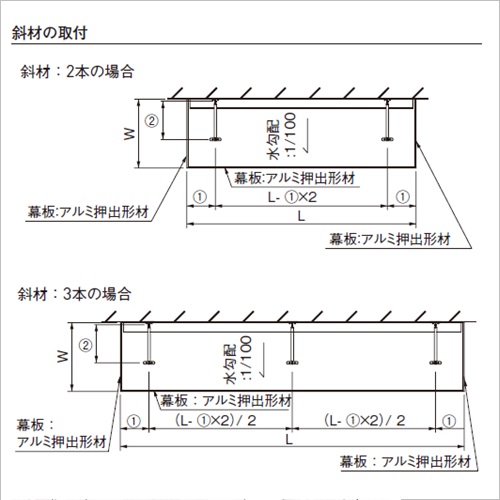 ・最小のパブリックスペースを確保する高剛性・軽量・高平滑性に優れたコンパクトサイズの庇です。【規格最小パネルサイズ1200×2000】 ・規格化されたアルミ接着ハニカムパネルの採用で、低コスト、短納期を実現しました。 ・凹凸のないすっきりとした軒下空間を創り、2〜3本の斜材で長さL寸法2000〜6000までを支持することが可能です。 ・ディティールにこだわったブラケットデザインや、幕板をはじめとする機能別のオプションもご用意しております。 [品番/呼称]AS-2040 [サイズ]W2000mm、L4000mm、t53mm [重量]110kg [材質]アルミ [仕上げ]フッ素樹脂焼付塗装 [ご注意] ・価格にはハニカムパネル本体・幕板・水切・斜材・躯体側ブラケット・パネルブラケット・六角ボルトを含んでおりますが、アンカー・シーリング材は含まれておりません。 ・規格品以外の特殊寸法、特殊納まり寸法は、受注生産となります。お問い合わせください。 ・オプション部品の鼻先チャンネルタイプ及び樋タイプのチャンネル、樋の取付けは先端先側のみです。両側面は幕板タイプ(F1)です。 樋は両端で垂れ流しとなります。(両端蓋はありません)詳しくはお問い合わせください。 ●斜材(本):3 ●取付寸法:(1)650mm、(2)1250mm、(3)100mm、(4)720mm、 ●仕様:表裏面板:アルミニウム板A3004P 表面処理:フッ素樹脂焼付塗装 パネル用接着剤:弾性シリコーン系接着剤 枠・幕板・水切:アルミ押出形材A6063S 斜材:SUSヘアライン仕上げ コア材:アルミ箔 A3003H 許容荷重:耐風圧3000N/平方メートル以下 積雪1m以下 購入に関する注意事項