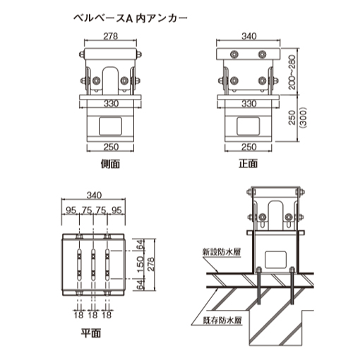 ・コンクリートの基礎を作らず、ベルベースを使うことで簡単に基礎工事が行えます。防水層を傷めない工法で、搬入の負担や音出しも軽減でき、工期の大幅短縮を実現できます。・80mmの高さ調整機能付きで、頭部のX軸、Y軸方向の位置調整も可能です。 ・重さは40〜50kgなのでコンクリート基礎の約1/4(180kg規格コンクリートの場合)です。 ・ベルベースの設置後も、一般的な防水層(アスファルト・塩ビシート・加硫ゴムシート・ウレタン塗膜の防水)の復旧が容易に行えます。 ・屋上面の水勾配に対し、頭部の高さ調整及び、水平出しが可能です。 ・太陽光発電設備、空調機器、高圧受電設備キュービクル、風力発電設備、携帯電話基地局、ゴンドラ設備など多種多様の設置工事に対応いたします。 ・内アンカーは、本体内側に4本アンカーを既存防水層を貫通させ施工します。躯体への固定で確実に本体を設置します。 ・外アンカーは、埋込長さ40mmの12本のアンカー(別途)全体で固定強度を確保します。既存防水層を貫通させないで施工します。保護コンクリートへの固定で防水層を傷付けません。 ・大きな荷重に対応した「ベルベースF」、大規模案件に適しコストパフォーマンスに優れた「ベルベースC2」も用意しています。 [サイズ]高さ450〜530mm、頭部340×278mm、底板250×250mm [重量]39kg [材質]スチール [仕上げ]溶融亜鉛メッキ [ご注意] ・水上用(高さ450〜530mm)、水下用(高さ500〜580mm)よりお選びください。 ・納期:ご確認ください。 購入に関する注意事項