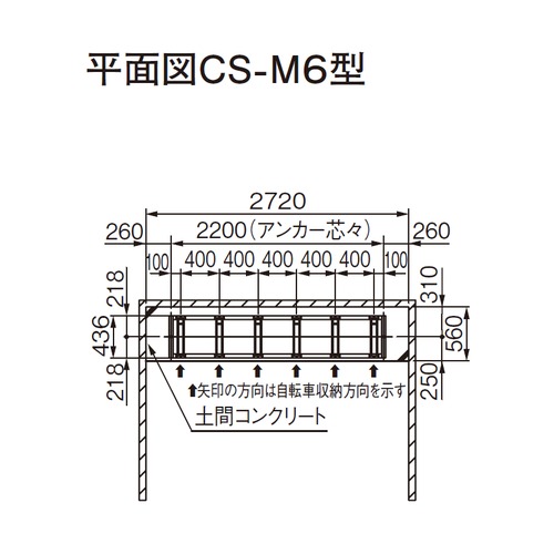 スタンドの高低順を入れ換えできます。防錆力の強い溶融亜鉛メッキ仕上です。 [サイズ]全幅2240mm、奥行436mm、高さ566mm [材質]スチール [仕上]溶融亜鉛メッキ [収容台数]6 [スタンドピッチ]400 [適合タイヤサイズ]幅45mm以下、径18?27インチ 購入に関する注意事項 ご注意 ・18インチ以上の自転車で設定されていますのでご注意ください。 ・アンカー工事費別途です。 ・自転車は別売です。 ・通路幅は収容した自転車後輪より1500mmが目安です。10台ごとに出し入れしやすいよう1台分のスペースをあけて設置してください。