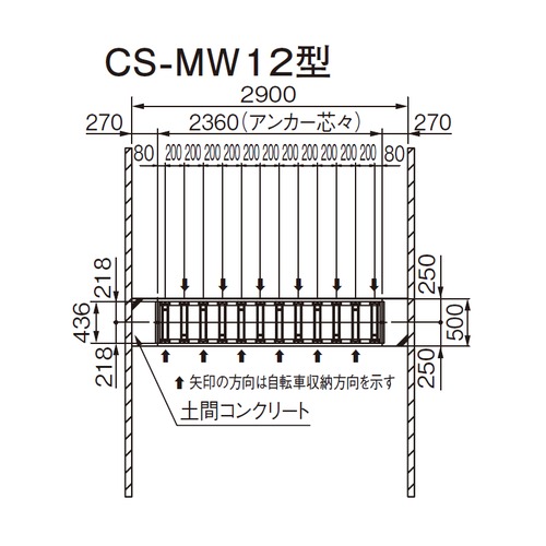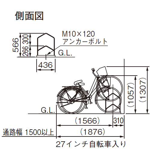 スタンドの高低順を入れ換えできます。防錆力の強い溶融亜鉛メッキ仕上です。 [サイズ]全幅2400mm、奥行436mm、高さ566mm [材質]スチール [仕上]溶融亜鉛メッキ [収容台数]12 [スタンドピッチ]200 [備考]複列式 [適合タイヤサイズ]幅45mm以下、径18?27インチ 購入に関する注意事項 ご注意 ・18インチ以上の自転車で設定されていますのでご注意ください。 ・アンカー工事費別途です。 ・自転車は別売です。 ・通路幅は収容した自転車後輪より1500mmが目安です。10台ごとに出し入れしやすいよう1台分のスペースをあけて設置してください。