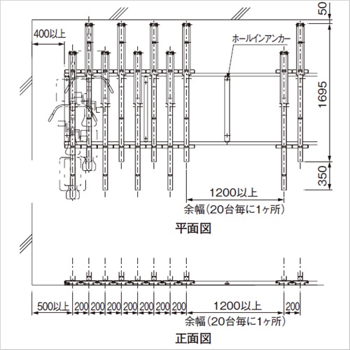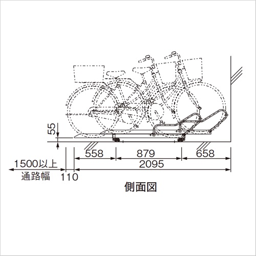[色]亜鉛メッキ色[サイズ]表記による [材質]溶融亜鉛メッキ鋼板 [仕上げ]溶融亜鉛メッキ 購入に関する注意事項 ・自転車1台あたりの価格です。 ・ラックのピッチ変更が可能です。(受注生産) 特長 ・ラックが左右に軽くスライドし、自転車の出し入れがスムーズにでき、また収納台数が大幅にアップします。 ・前輪に錠をかけたまま収納できます。 ・女性やお子様でも簡単に収納できます。 ・材質に優れた溶融亜鉛メッキ鋼板を採用しました。 ・タイヤ幅が53mmの自転車まで収納できます。 ・20〜27インチの自転車まで収納できます。 ・全長1870mmまでの電動アシスト自転車(35kgまで)に対応できます。 ご注意 ・標準図は10台収容例です。 ・スライド余幅は20台毎に1箇所設けるのが目安です。