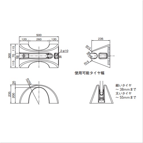 住宅、店舗、公共施設などでの駐輪にご使用いただけます。出し入れスムーズ!軽く押すだけでラクラク駐輪できます。 強風・地震・接触などによる自転車の転倒を防止します。 樹脂製なのでタイヤにやさしく、丈夫で長持ちです。 [サイズ]H235mm、W500mm、D300mm [本体重量]6.0kg [付属品]コンクリートアンカーボルト(M8×70mm)1本 コンクリートアンカーボルト(M8×90mm)1本 粘着テープ(幅20×2000mm) [材質]合成樹脂 【ご注意】壁から300mm以上は離して設置してください。複数設置する場合は、600mm以上離して設置してください。使用可能タイヤ径は、18~28インチです。 購入に関する注意事項