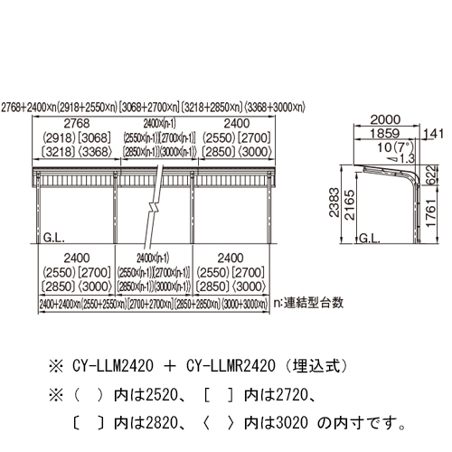 ・スタンダードな奥行2000mmタイプです。・奥行2450・2660mmもございます。お問い合わせください。 ・間口サイズは5種類です。(2660mmは、柱ピッチ2400mmのみ) ・間口2400mmタイプは基礎を変えることで 積雪1200N、風速38m/sに対応可能です。 ・軒樋は標準装備されています。(立樋は基準型には標準装備、連結型にはオプションです。立樋は3スパンごとに1本必要です。) 購入に関する注意事項 ※画像は代表画像です。 ご注意 ・価格は埋込式基礎仕様です。ベース式基礎仕様は価格が異なります。お問い合わせください。 ・運搬諸経費は別途お問い合わせください。