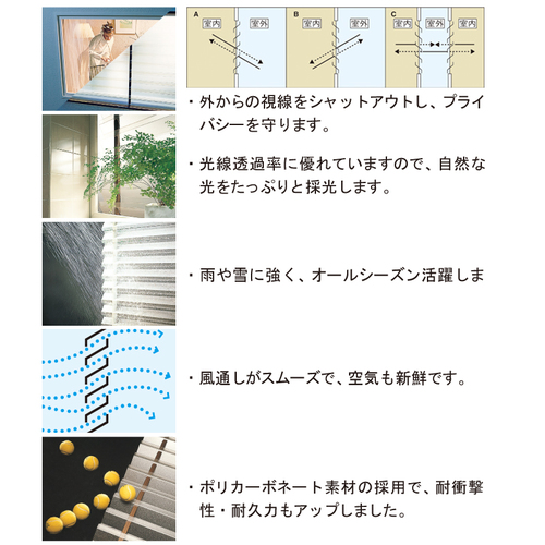 ・外からの視線をシャットアウトし、プライバシーを守ります。・光線透過率に優れていますので、自然な光をたっぷりと採光します。 ・雨や雪に強く、オールシーズン活躍します。 ・風通しがスムーズで、空気も新鮮です。 ・ポリカーボネート素材の採用で、耐衝撃性・耐久力もアップしました。 [色]ステンカラー [サイズ]H660mm、W2000mm [材質]アルミ・ポリカーボネート [仕上げ]半透明マット [ご注意] ・品番のブロンズ、ホワイト、ステンカラーは、アルミ材(笠木・中桟)の色です。 ・本体には、取付用ブラケット(出幅100mm、SUS304)、笠木キャップ4個、タッピンビス、ボルト・ナット、テクスネジ一式が付属しています。 ・運搬諸経費は別途お問い合わせください。 ●羽根数:6枚 ●中桟数:4本 ●BK数:4個 購入に関する注意事項