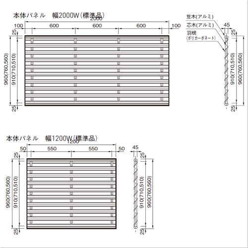 ・光線透過率に優れていますので、自然光をソフトに拡散し、やさしく視線を遮ります。・金具が見えない美しい仕上がりです。 ・長さ調節の切断ができるので設置場所にピッタリ収まります。パネルと部材のシステム部材なので、建物と調和したフェンスづくりが可能です。 ・ポリカーボネートは弱酸、アルコール、油などに安定しますが、アルカリ、芳香族炭化水素、塩素化脂肪炭化水素類には溶解します。 [色]ブロンズ [サイズ]H760mm、W1200mm [材質]アルミ・ポリカーボネート [仕上げ]半透明マット [ご注意] ・耐薬品性は温度と応力によって変わりますので、薬液存在下での使用には十分ご試験ください。 ・ブロンズ、ホワイト、ステンカラーはアルミ材(笠木、中桟)の色です。 ・パネル本体のみで、笠木用のFキャップ、施工用各種部材は別売りです。 ・下記の他に660、860、1060、1160、1260の準規格もあります。 ●羽根数:7枚 ●笠木・中桟の色:ブロンズ、ホワイト、ステンカラー 購入に関する注意事項
