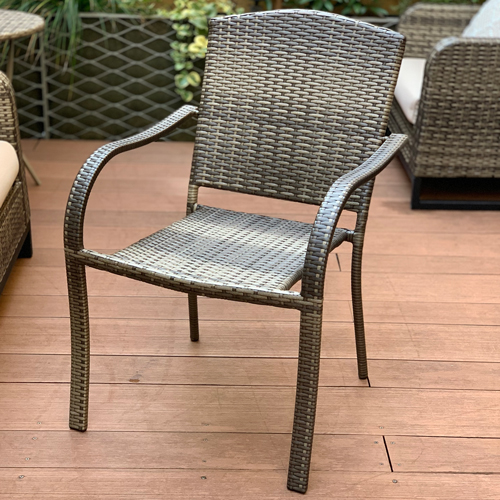 [使用時サイズ(mm)]W585×D700×H890×SH435、(手掛け)640[手掛けの幅(mm)]45 [材質]スチール、人工ラタン [耐荷重(kgf)]110 [重量(kg)]5.6 [備考]完成品 購入に関する注意事項 特長 人工ラタンをあしらったスタッキングチェア。 ゆったり寛げるようにラタンの質感と座面の広さにこだわりました。 人工ラタンは、手触りも滑らかで、お手入れも簡単です。 天候や紫外線などの影響も受けにくく、長期に渡りご利用いただけます。 落ち着いたブラウン系のカラーリングです。 広々と落ち着きのある作りのサハラ・ダイニングテーブルとセットでどうぞ。 いつものテラスがアジアのリゾートに早変わり。 ご注意 クリーニングとメンテナンス ・簡単な汚れは、乾いた布で拭き取ってください。汚れがひどい場合は水拭きしてから水気の残らないように柔らかい布で乾拭きしてください。酸やアルカリの強い洗剤、薬品は使用しないでください。 ・定期的にネジにゆるみがないか点検してください。ゆるんだままの使用は大変危険です。また移動した場合も必ず点検してください。 【予めご了承下さい】 ・スチール製品は経年変化でサビが発生することは、避けられません。 ・スチール製品は、塩害を受けやすい沿岸部付近や排気ガスを受けやすい場所では腐食や変色の進行が早まります。 ・アルミ製品は鉄や銅などの異種金属と直接接触すると腐食する可能性があります。 ・樹脂製品は紫外線や温度の影響で変色、変形する場合があります。 ・部品の形状・仕様等は、予告なく変更する場合があります。ご了承下さい。