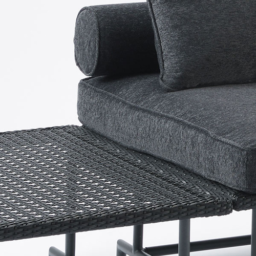 [ソファサイズ(mm)]W1450×D850×H720×座面高さ410[テーブルサイズ(mm)]W710×D810×高さ300 [材質]スチール、人工ラタン(ポリエチレン) [クッション材質](カバー)ポリエステル、(中身)ポリウレタンフォーム・ポリエステル綿 [仕上げ]ポリエステル粉体塗装 [耐荷重(kgf)]チェアー150、テーブル40 [重量(kg)]チェアー17.1、テーブル6.7 [原産国]ベトナム [備考]組立品 購入に関する注意事項 ※配送に関する注意事項がありますので、詳細はお問合せください。 特長 MA series(マ シリーズ)は「間と余白のあるアウトドアファニチャー」をコンセプトに、素材やデザインに加え、スケール感も高級感を生み出すものであるととらえ誕生しました。 大きなひじ掛け、奥行きのある座面、テーブルの余白スペースなど、広さを感じられる設計を施すことにより、 ゆったりと寛いだり、本、グラス、フラワーベースやランプなどを置いたり、用途や空間により多様なシーンが生まれるPATIO PETITEの新シリーズです。 籠目文様に編み上げた人工ラタンのサイドテーブルつきのダブルソファ。 サイドテーブルを好きな位置に移動できます。 ご注意 クリーニングとメンテナンス ・簡単な汚れは、乾いた布で拭き取ってください。汚れがひどい場合は水拭きしてから水気の残らないように柔らかい布で乾拭きしてください。酸やアルカリの強い洗剤、薬品は使用しないでください。 ・定期的にネジにゆるみがないか点検してください。ゆるんだままの使用は大変危険です。また移動した場合も必ず点検してください。 【予めご了承下さい】 ・スチール製品は経年変化でサビが発生することは、避けられません。 ・スチール製品は、塩害を受けやすい沿岸部付近や排気ガスを受けやすい場所では腐食や変色の進行が早まります。 ・アルミ製品は鉄や銅などの異種金属と直接接触すると腐食する可能性があります。 ・樹脂製品は紫外線や温度の影響で変色、変形する場合があります。 ・部品の形状・仕様等は、予告なく変更する場合があります。ご了承下さい。